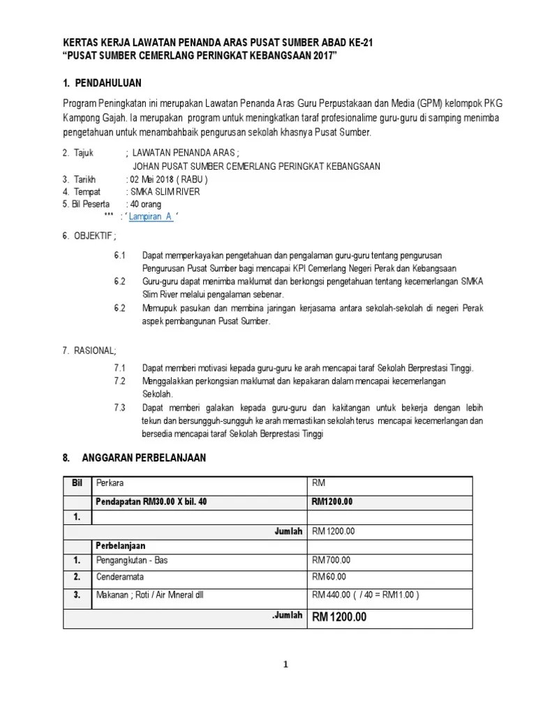 Kertas kerja lawatan penanda aras ts25 Kertas kerja lawatan penanda aras. Jom pergi dan semoga apabila selesai lawatan ini, amalan yang baik ini boleh dipraktikkan. Kertas kerja lawatan penanda arasanjabatan pengurusan pelajarkolej matrikulasi labuan, kpm ke universiti negara brunei darussalam1.tajuk. Kertas kerja lawatan penanda aras programâ â penanda aras pusat sumber sekolah: Lawatan tersebut bertujuan melihat kepada 5s psb,.